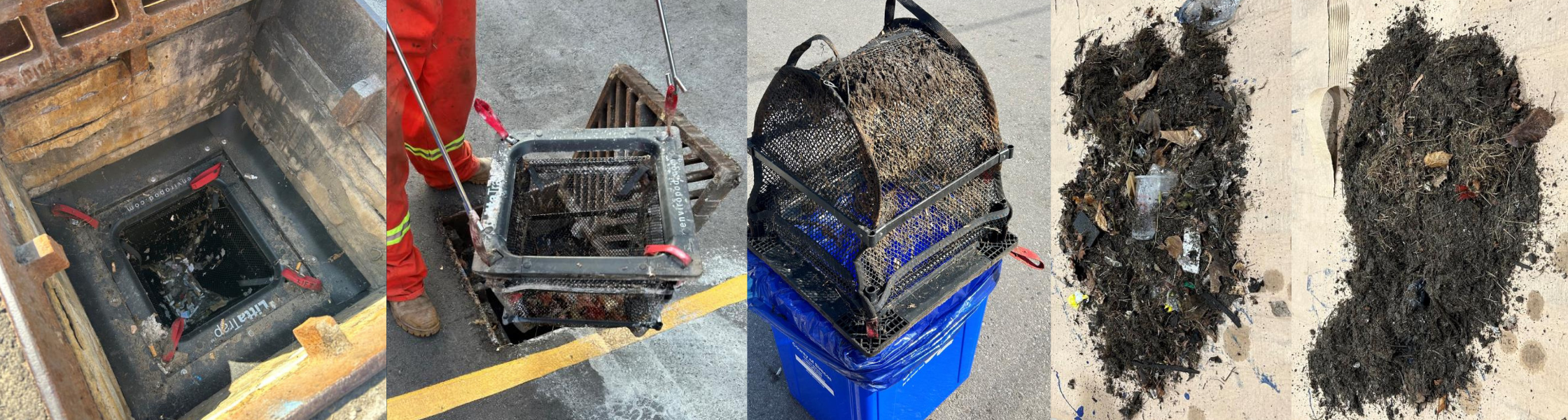 The program was monitored over an 11-month period, with maintenance and data collection carried out during two cleanout events in September 2024 (fall) and April 2025 (spring). At each cleanout, captured material was removed, weighed, and sorted into sediment (sand/silt), organic material, and plastics/litter to better understand pollutant composition and loading.
